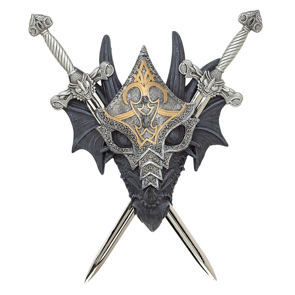 • From beneath the hood of his intricate armor, a horned dragon inspires heartfelt fear with his malicious stare. Removable swords are a chillingly accurate miniature version of the mighty weapons wielded by history's fiercest warriors. (Decorative purposes only).