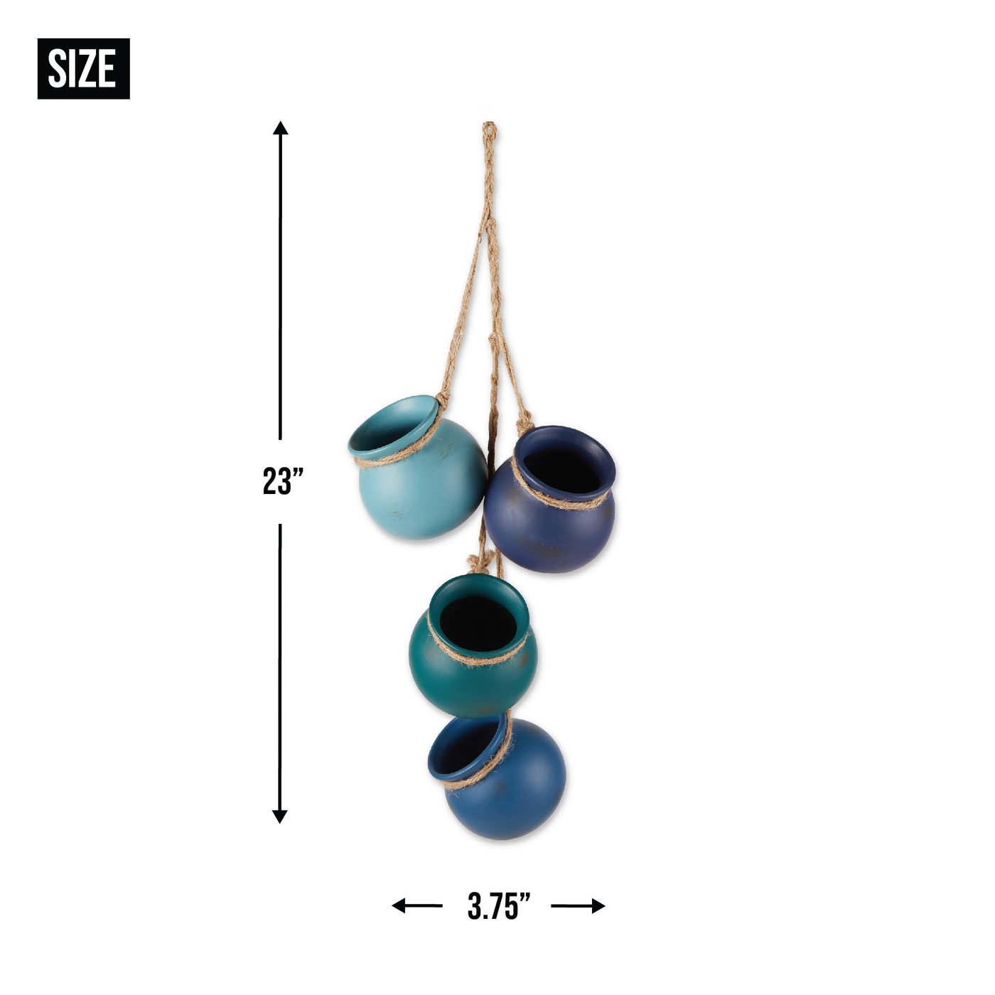 • Straight from the kitchen of a Santa Fe gourmet, this darling decoration recalls the fabled cooking pots treasured for generations in the Southwest. Four graceful ocean toned vessels with jute hanging loop are ready to brighten any corner.