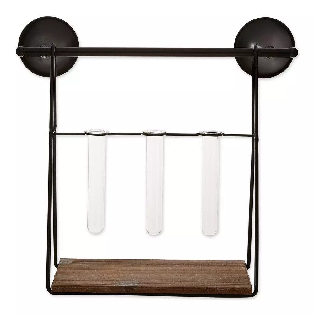 • Featuring a black iron frame with a wooden shelf and 3 small vases, this is the perfect plant propagation paraphernalia! Fill with the plants or décor of your choice to create a stunning wall mounted piece.