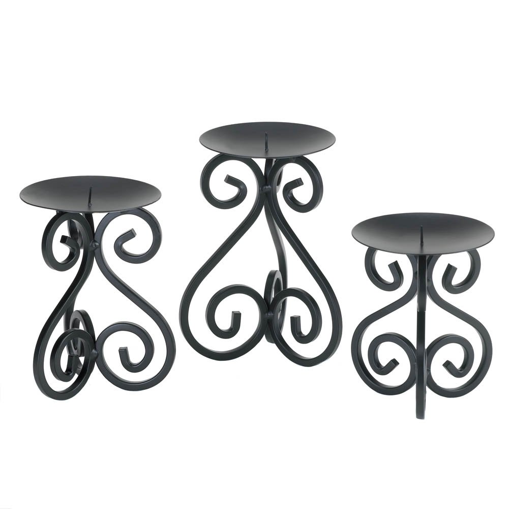 • Thick, black iron rods curl and bend to create three beautiful pedestals for the lucky pillar candles of your choice. Each stand of this trio is a different height, and when placed together they create a visually stunning display of candlelight. This set is perfect for your mantel or even as the centerpiece of your table!