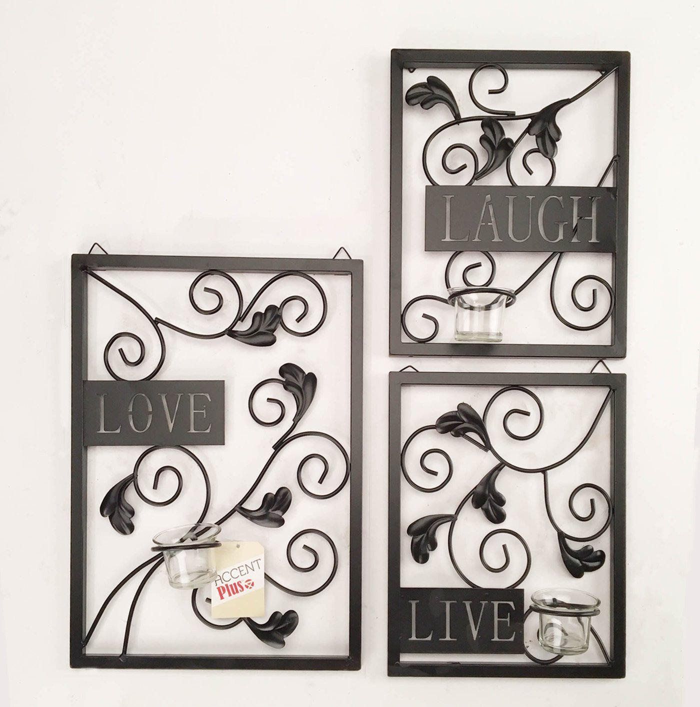 • Remind yourself what's important everyday with this splendid set of three candleholder wall plaques. Made from dark metal, each piece carries a clear glass candle cup and a wise word, "Live, Love, Laugh."