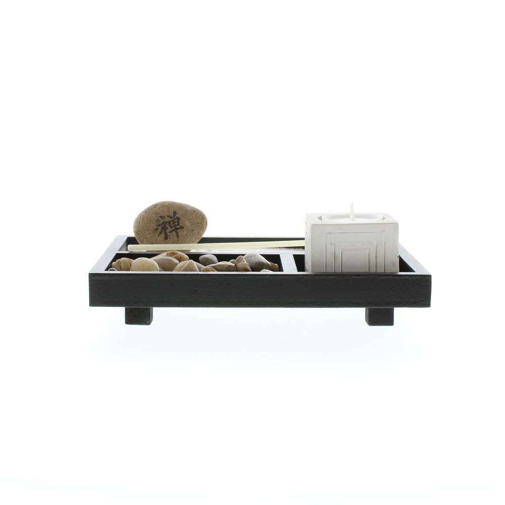 • Enjoy your own private Zen garden, even if you're short on space! Nifty tabletop box contains every essential- sand, rocks, candleholder and rake- to create a serenely scenic escape from the everyday.