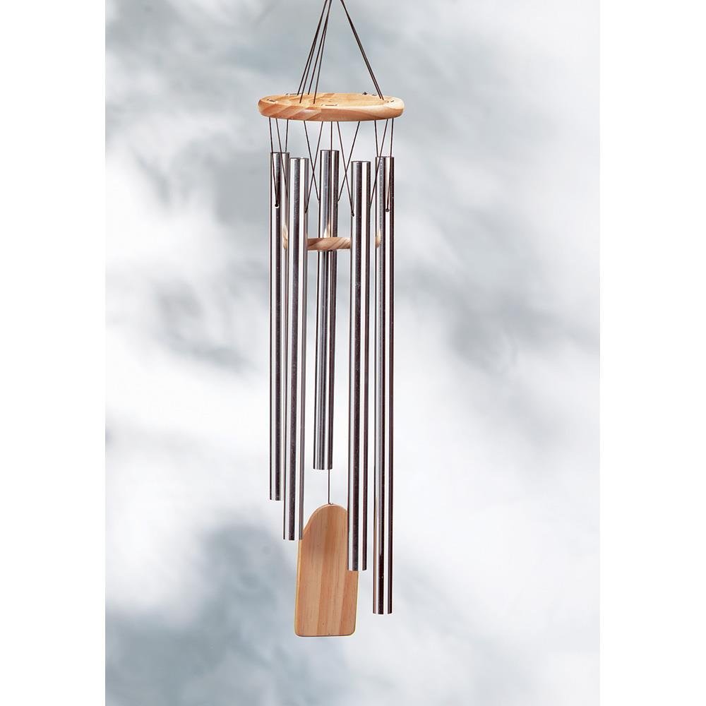 Nature's own music sounds best when accompanied by the soft, gentle tones of this set of aluminum and wood wind chimes. A natural pine finish makes this a lovely porch decor item. Weight 0.2 pounds 5.5" x 5.5" x 24". Aluminum, Wood, Pine Finish. UPC: 849179011789.