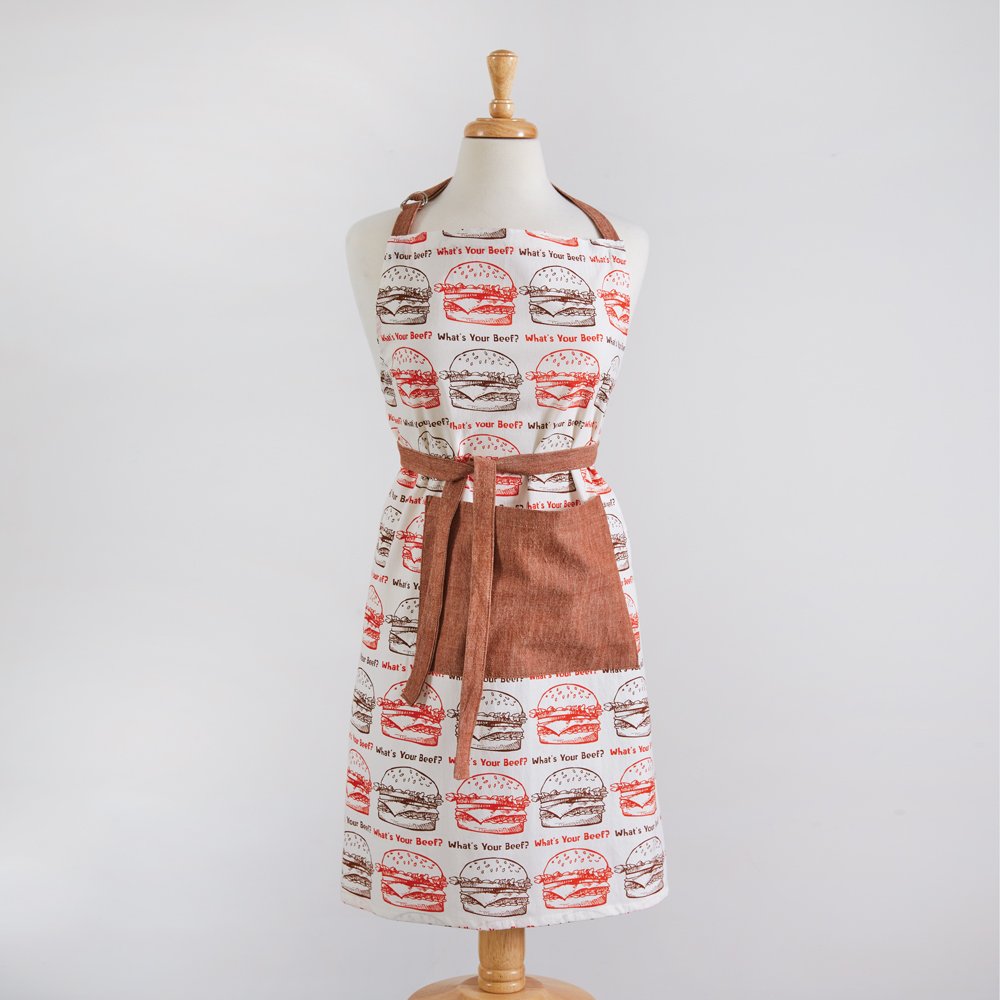 What’s your beef? This kitchen essential set is perfect for all the master grillers and chefs out there! Set includes an apron, tea towel, and oven mitt. Tea towel is 20''W x 28''H and oven mitt is 7''W x 13''H. Apron has a neck tie, a waist tie, and a pocket in the front. Made of 100% cotton. Tea towel features a corner hanging tab. 100% Cotton. Machine wash cold. Tumble dry. Warm iron on reverse. Pot holder has a hanging loop for easy storage.