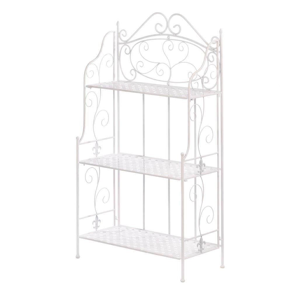 • Add style and organization to your room with this beautiful white bakers rack. It features three basket weave shelves, scrolling flourishes for added style, and a few fleur-de-lis accents that are the perfect finishing touch.